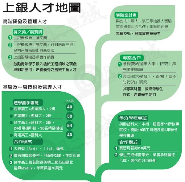 而今站在技職復(fù)興浪頭上,上銀導(dǎo)軌推出產(chǎn)學(xué)攜手專(zhuān)班,繼西螺農(nóng)工后,現(xiàn)與虎尾高工、臺(tái)中高工、高雄高工合作,搭配不同的科大,在高工階段網(wǎng)羅人才。去年起更與工具機(jī)公會(huì)、勤益科大等十一所技專(zhuān)合作推出十九個(gè)兩年“學(xué)分學(xué)程專(zhuān)班”,學(xué)生只要完成規(guī)定修習(xí)學(xué)分,幾可百分之百錄用。
