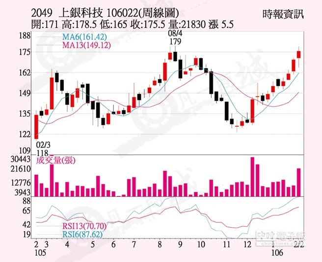 上銀(2049)因景氣好轉(zhuǎn)、大陸對智慧自動化及機(jī)器人需求持續(xù)升溫,滾珠螺桿、直線導(dǎo)軌及機(jī)器人等三大主力產(chǎn)品首季訂單滿載,訂單能見度看到4、5月,元月營收創(chuàng)同期次高,上周五吸引外資及自營商合計(jì)買超1,971張,推升股價(jià)上漲3.5元、收175.5元,單周漲幅3.24%。
