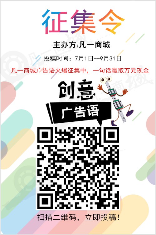 ??(1)關(guān)注“凡一傳動(dòng)商城”官方微信公眾號(hào)(fgforrun)。在自定義菜單點(diǎn)擊“凡一廣告語”,進(jìn)入投稿頁面,輸入你為凡一商城量身定義的廣告語+姓名+手機(jī)號(hào)碼,并提交即可。