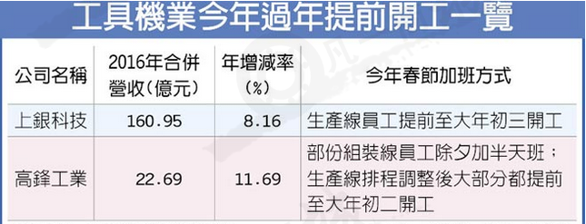 一例一休墊高生產(chǎn)成本,今年農(nóng)歷春節(jié)假期又比去年少,工具機(jī)業(yè)過年加班趕工盛況不再,僅上銀集團(tuán)、高鋒等少數(shù)廠商需要提前開工。上銀集團(tuán)首季訂單滿載,直線導(dǎo)軌及機(jī)器人生產(chǎn)線人員提前至大年初三趕工;高鋒部份組裝生產(chǎn)線人員除夕要上半天班,且多提前至初二開工。