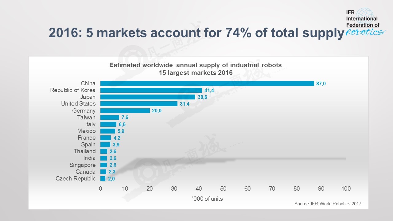 機(jī)器人行業(yè)增長最快的是亞洲-其中以中國這個(gè)現(xiàn)為世界第一的市場領(lǐng)先。在2017年,亞太-澳洲地區(qū)的機(jī)器人裝置估計(jì)增長了21%。美洲地區(qū)的機(jī)器人供應(yīng)將增長16%,歐洲增長8%。這一發(fā)展的重要推動(dòng)力是:為因應(yīng)更快速的商業(yè)循環(huán),以及所有制造行業(yè)的客戶都要求更大生產(chǎn)彈性與客制化,而采用機(jī)器人。新一代工業(yè)機(jī)器人將為更加靈活的自動(dòng)化鋪路。