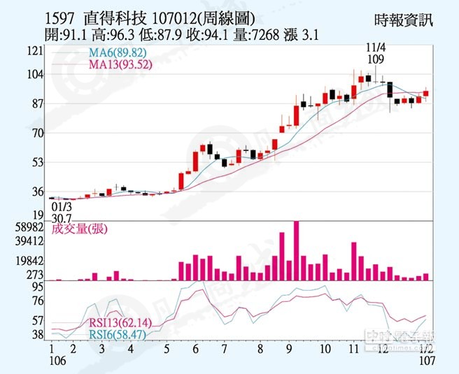 直得科技(CPC)去年因半導(dǎo)體、面板及光電等產(chǎn)業(yè)對智慧自動化及機器人需求殷切而受惠,去年合并營收逼近15億元,改寫歷史新高,市場預(yù)期CPC今年產(chǎn)能擴增2、3成,營收及獲利可創(chuàng)新高,上周股價上漲5.5元而以94.1元收盤,周漲幅3.41%。