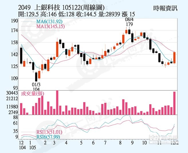 上周,在外資持續(xù)買超帶動下,上銀科技終場股價上漲3.5元、收144.5元,一舉突破周線、月線及季線反壓套牢區(qū),股價周漲幅11.58%。