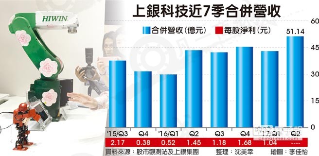 上銀三大主力商品滾珠絲桿、直線導(dǎo)軌及機(jī)器人,因全球力推工業(yè)4.0,對(duì)智慧自動(dòng)化設(shè)備需求殷切,智慧自動(dòng)化需要用到滾珠絲桿及直線導(dǎo)軌等關(guān)鍵零組件,加上全球景氣逐步回升,尤其今年大陸、歐洲及日本等地市場(chǎng)需求持續(xù)成長(zhǎng),帶旺6月合并營(yíng)收攀升至17.71億元,年增加14.55%,續(xù)創(chuàng)單月營(yíng)收新高;第2季合并營(yíng)收51.14億元,年增18.15%,創(chuàng)單季營(yíng)收高;上半年合并營(yíng)收高達(dá)94.02億,也創(chuàng)同期新高,表現(xiàn)優(yōu)于市場(chǎng)預(yù)期。