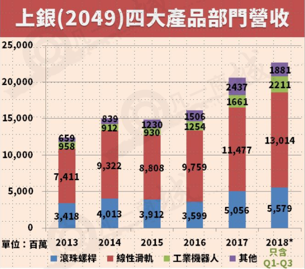 直線導(dǎo)軌和滾珠絲桿貢獻八成營收,2018年的第一季到第三季工業(yè)機器人部門年增率102%!