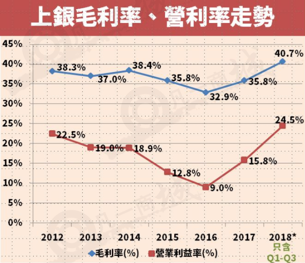 2018年第一季至第三季毛利率超過4成,營利率從15.8%大幅上升到24.5% ,基本每股盈余連續(xù)兩年翻倍。