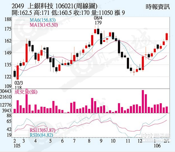 上銀大廠(2049)因滾珠螺桿、直線導軌及機器人三大主力產(chǎn)品,17年首季訂單因大陸對智慧自動化設(shè)備及機器人需求增溫而滿載,開始接第2季訂單,今年合并營收要挑戰(zhàn)200億元目標,上周五三大法人聯(lián)手買超1,599張,股價上漲7.5元、收170元,周漲幅5.59%。