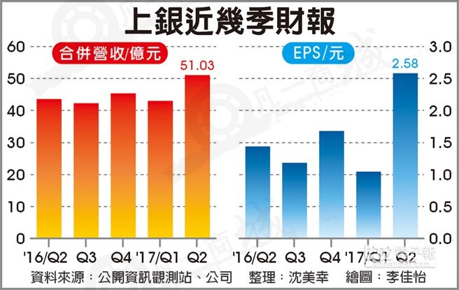 上銀董事會(huì)承認(rèn)上半年財(cái)報(bào),第2季合并營收51.03億元,營業(yè)毛利17.46億元,毛利率從去年同期的34.19%提高至34.23%,主要是產(chǎn)能利用率提升及第2季產(chǎn)品漲價(jià),加上認(rèn)列1.3億元匯兌收益,推升稅前凈利至8.31億元、稅后凈利6.29億元,EPS從去年同期的1.44元回升至2.58元,季增148.08%,年增79.17%。