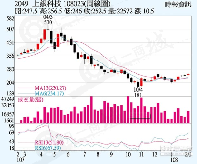 上銀科技1月合并營收16.67億元,雖出現(xiàn)近21個月新低,但法人樂觀自動化設(shè)備需求會從年中開始回溫,對上銀滾珠絲桿、直線導(dǎo)軌等傳動組件需求也增溫,外資及自營商上周五合計買超505張,帶動股價上漲5.5元、收252.5元,周漲幅4.33%,收復(fù)周、月及季線。