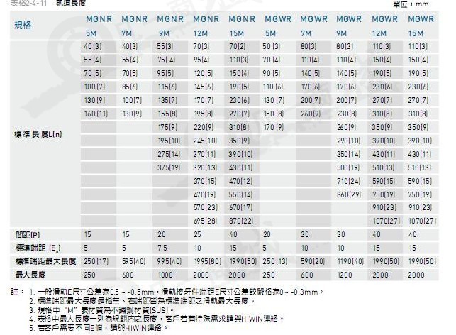 微型上銀導(dǎo)軌MGN/MGW系列備有滑軌標(biāo)準(zhǔn)長(zhǎng)度庫(kù)存,以供應(yīng)客戶(hù)需求。若客戶(hù)訂購(gòu)非標(biāo)準(zhǔn)長(zhǎng)度滑軌時(shí),端面距離E的尺寸,最好不要大于1/2P,防止因E的尺寸過(guò)大,導(dǎo)致滑軌裝配后端部的不穩(wěn)定,而降低線(xiàn)性滑軌的精度,亦不可取用過(guò)小的E值 (小)以避免螺栓孔破孔。