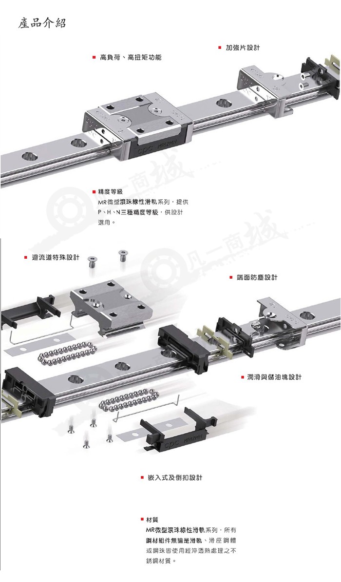 CPC直線導(dǎo)軌為一種滾動導(dǎo)引,借由鋼珠在滑塊與滑軌之間作無限滾動循環(huán),負(fù)載平臺能沿著滑軌輕易地以高精度作線性運(yùn)動。再加上滑塊與滑軌間的束制單元設(shè)計,使得CPC直線導(dǎo)軌可同時承受上下左右等各方向的負(fù)荷,上述陳列特點并非傳統(tǒng)滑動導(dǎo)引所能比擬,因此機(jī)臺若能配合滾珠螺桿,使用CPC直線導(dǎo)軌作導(dǎo)引,必能大幅提高設(shè)備精度與機(jī)械效能。與傳統(tǒng)的滑動導(dǎo)引相較,滾動導(dǎo)引的摩擦系數(shù)可降低至原來的1/50,由于起動的摩擦力大大減少,相對的較少無效運(yùn)動發(fā)生,故能輕易達(dá)到μm級進(jìn)給及定位。