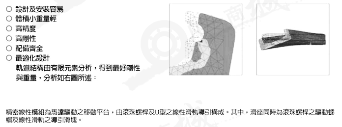 (2)體積小重量輕: U型軌道可當(dāng)導(dǎo)引軌道,亦用搭平臺(tái)結(jié)構(gòu),大幅縮小安裝體積,并以有限元素法設(shè)計(jì)出最佳化結(jié)構(gòu),得到最佳剛性與重量比例。低扭力與低慣量的平順定位運(yùn)動(dòng),可減少能源耗用。