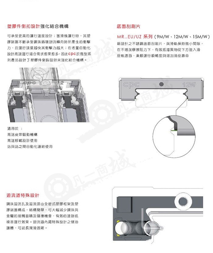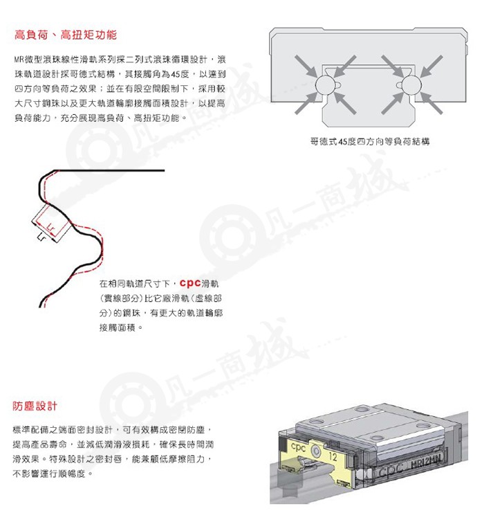CPC直線導(dǎo)軌為一種滾動導(dǎo)引,借由鋼珠在滑塊與滑軌之間作無限滾動循環(huán),負(fù)載平臺能沿著滑軌輕易地以高精度作線性運動。再加上滑塊與滑軌間的束制單元設(shè)計,使得CPC直線導(dǎo)軌可同時承受上下左右等各方向的負(fù)荷,上述陳列特點并非傳統(tǒng)滑動導(dǎo)引所能比擬,因此機臺若能配合滾珠螺桿,使用CPC直線導(dǎo)軌作導(dǎo)引,必能大幅提高設(shè)備精度與機械效能。與傳統(tǒng)的滑動導(dǎo)引相較,滾動導(dǎo)引的摩擦系數(shù)可降低至原來的1/50,由于起動的摩擦力大大減少,相對的較少無效運動發(fā)生,故能輕易達(dá)到μm級進(jìn)給及定位。