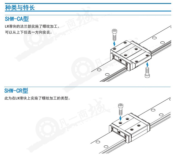 (寬幅低重心):SHW型的LM軌道寬度較大并采用低重心結(jié)構(gòu),最適合安裝在要求節(jié)省空間的場所,以及要求M力矩剛性的場所的等
