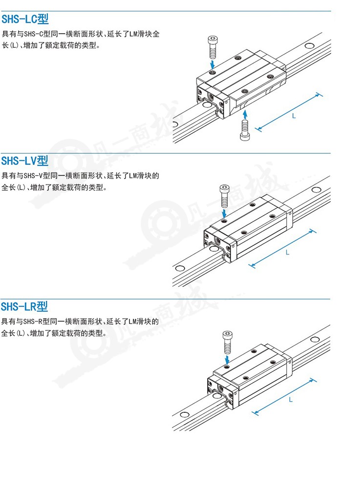 SHS-LC型:具有與SHS-C型同一橫斷面形狀,延長了LM滑塊全長(L)增加了額定負荷的類型.